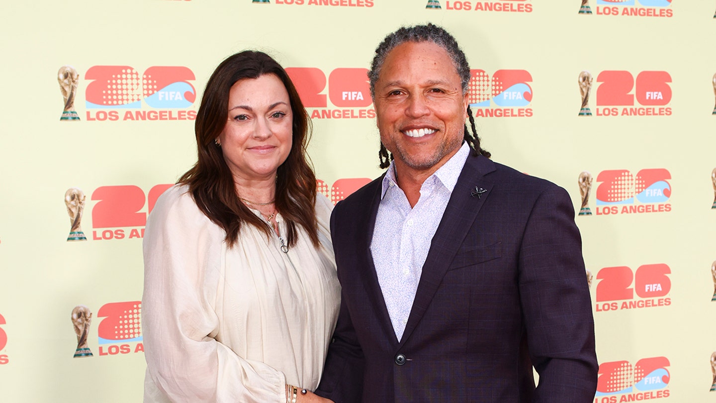 Former professional footballer and commentator Cobi Jones and wife Kim Reese forms a photo on the red carpet in one year for the FIFA World Cup 26 event at Fox Studio Lot 11 June 2025 in Los Angeles. (Jessica Alcheh/IMAGN -Pictures)