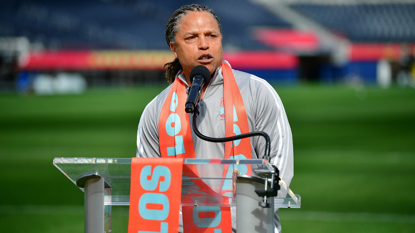 Former American men’s national team footballer Cobi Jones speaks on March 13, 2025 in Inglewood, California, during the reveal of the new test football field in anticipation of the Nations League Play and the 2026 World Cup at Sofi Stadium. (Gary A. Vasquez/Imag- Pictures)