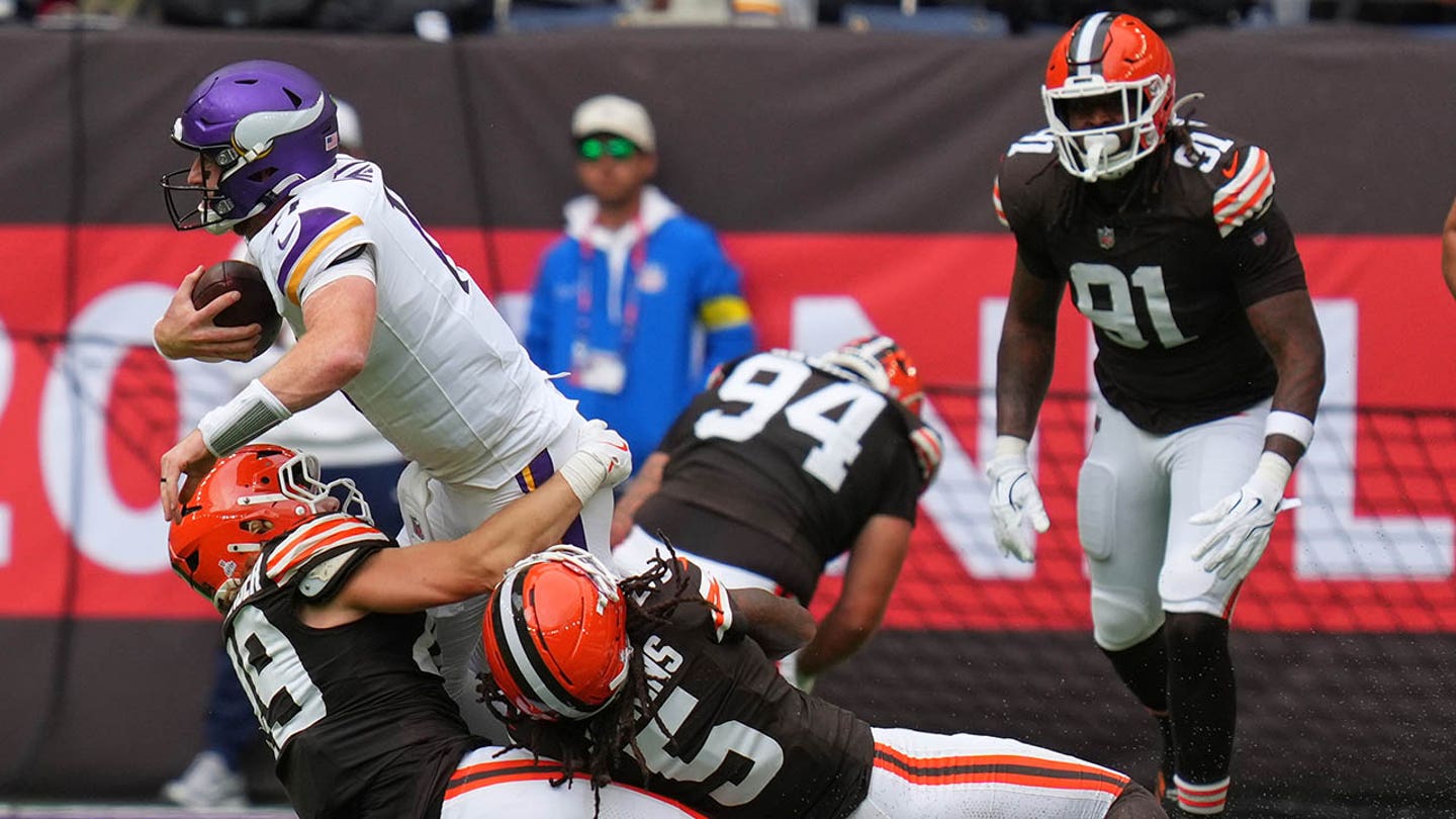 Minnesota Vikings Quarterback Carson Wentz (11) is thanked during the first half of the NFL game between Minnesota Vikings and Cleveland Browns at Tottenham Hotspur Stadium in London, Sunday 5th October 2025. (AP Photo/Kirsty Wigglesworth)
