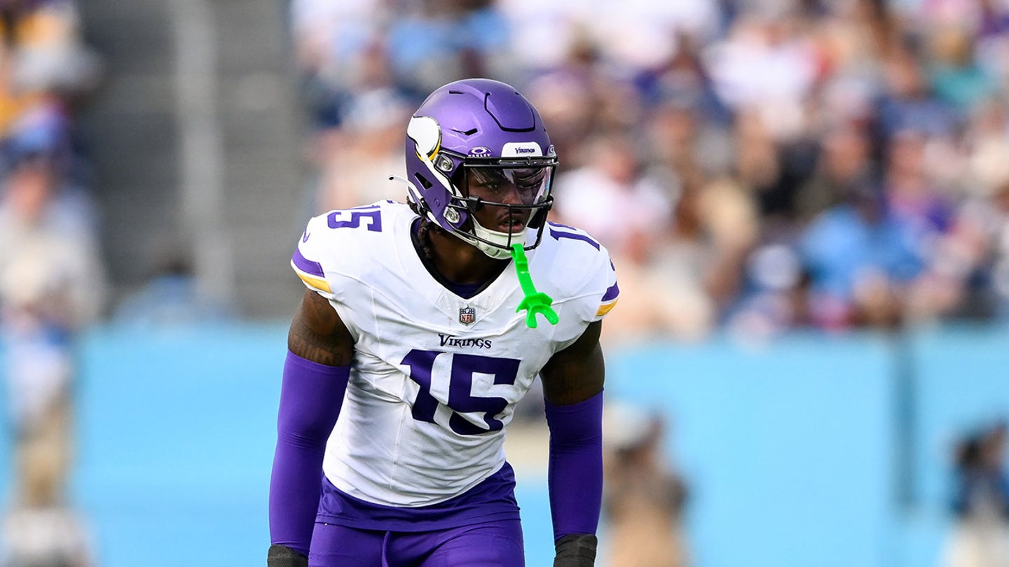 Minnesota Vikings Linebacker Dallas Turner, #15, looks at before the game against Atlanta Falcons at US Bank Stadium. (Matt Krohn-IMAGN images)
