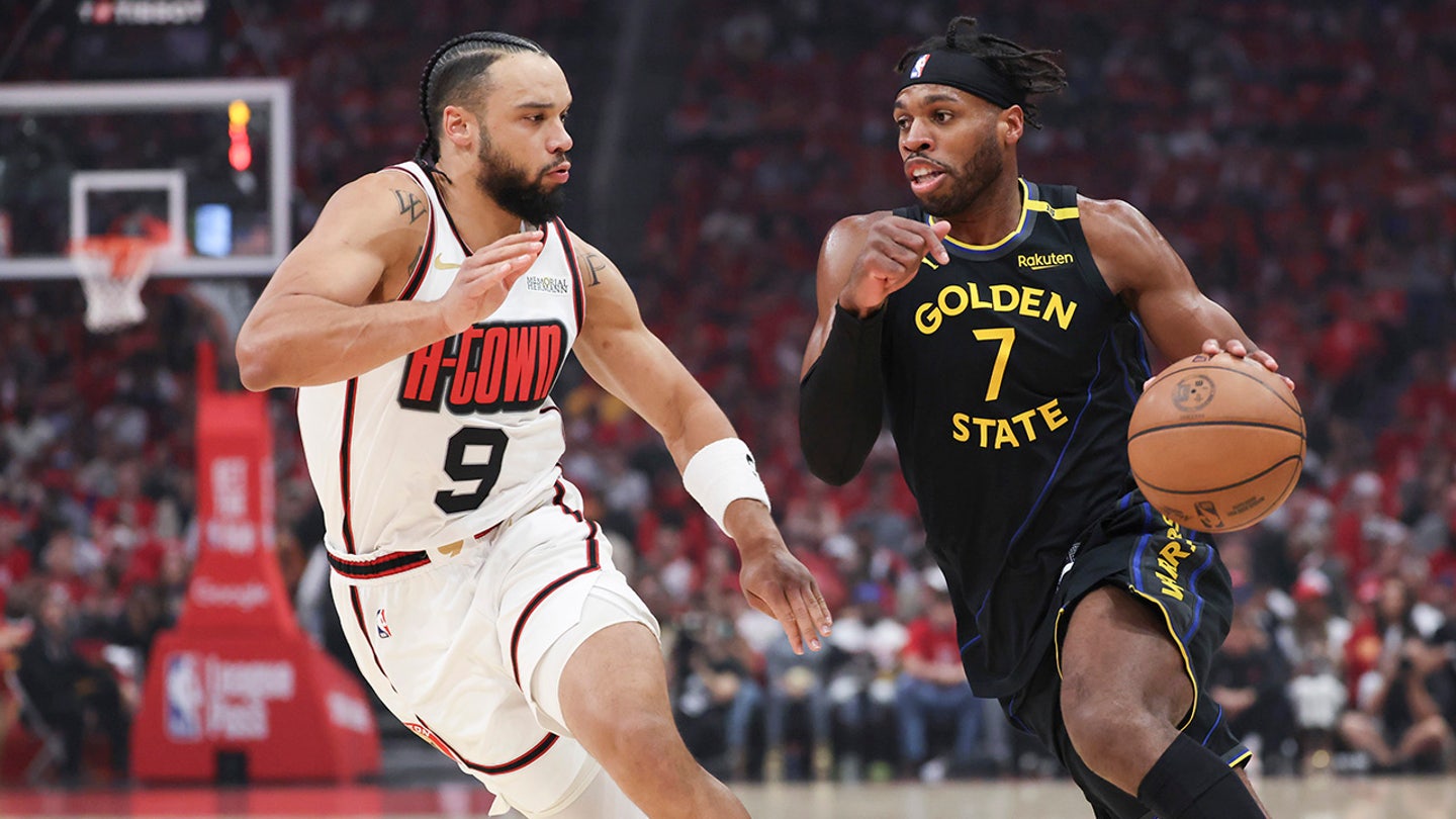 Golden State Warriors Guard Buddy Hield, No. 7, dribbles the ball as Houston Rockets Frem Dillon Brooks, #9, defends during the first quarter of the game seven of the first round of 2025 NBA Playoffs at the Toyota Center in Houston on May 4, 2025. (Troy Taormina-Preferred Pictures)