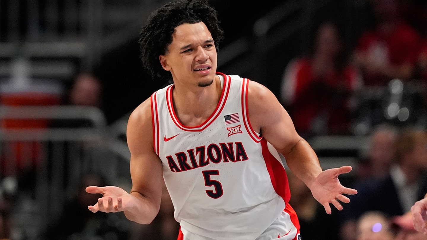 Arizona’s Brayden Burries reacts after making a basket in the first half of an NCAA college basketball game against Houston in the championship game of the Big 12 Conference tournament, Saturday, March 14, 2026, in Kansas City, Missouri. (AP Photo/Charlie Riedel)