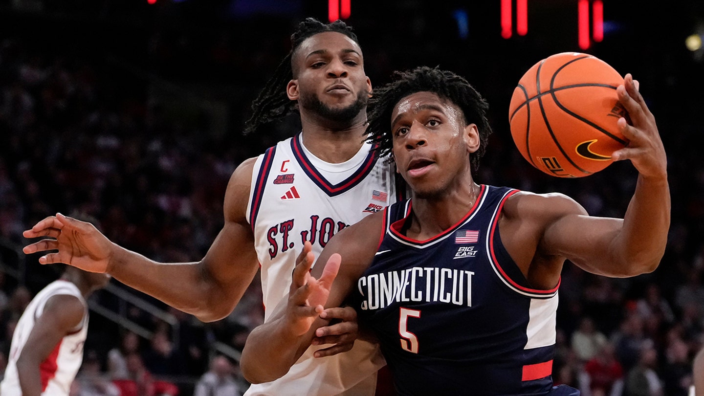 UConn forward Tarris Reed Jr. (5) tries to drive past St. John’s forward Zuby Ejiofor (24) during the second half of an NCAA college basketball Big East tournament championship game, Saturday, March 14, 2026, in New York. (AP Photo/Yuki Iwamura)