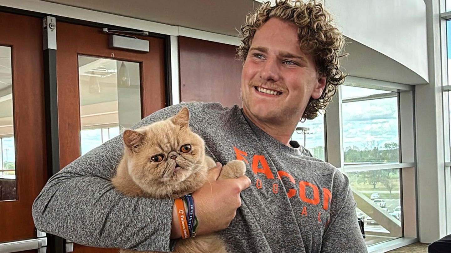 Bowling Green Long Snapper George Carlson, who holds his 3-year-old Persian Shorthair Cat Pudge, will be interviewed in the Sebo Athletic Center at Bowling Green State University in Bowling Green, Ohio, Monday, August 25, 2025. (AP Photo/Joseph Reedy)