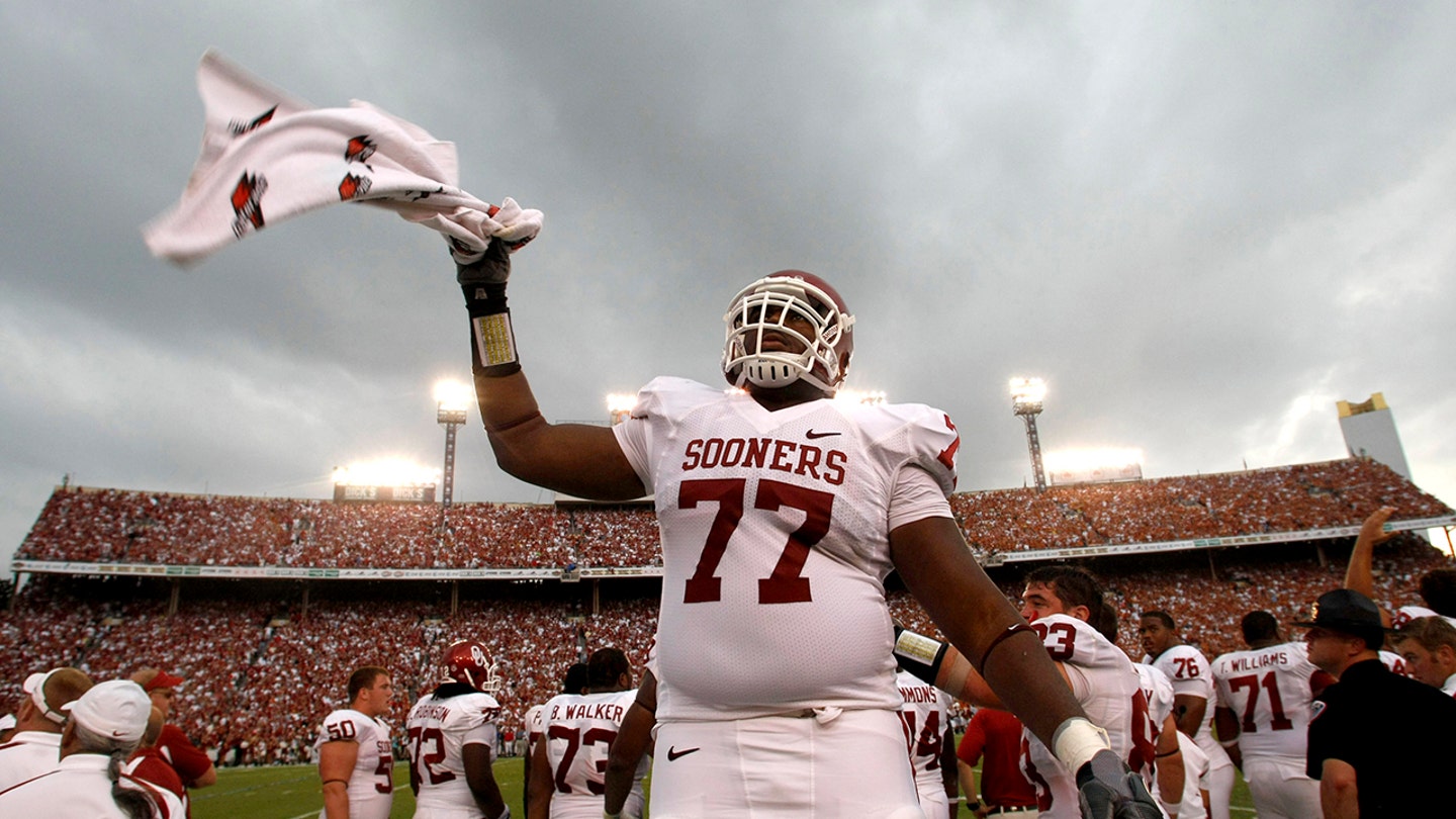 Oklahoma’s Sherrone Moore celebrates after a defensive stop late in the fourth quarter against Texas, Saturday, Oct. 6, 2007, at the Cotton Bowl in Dallas, Texas. (Sharon M. Steinman/Fort Worth Star-Telegram/Tribune News Service via Getty Images)