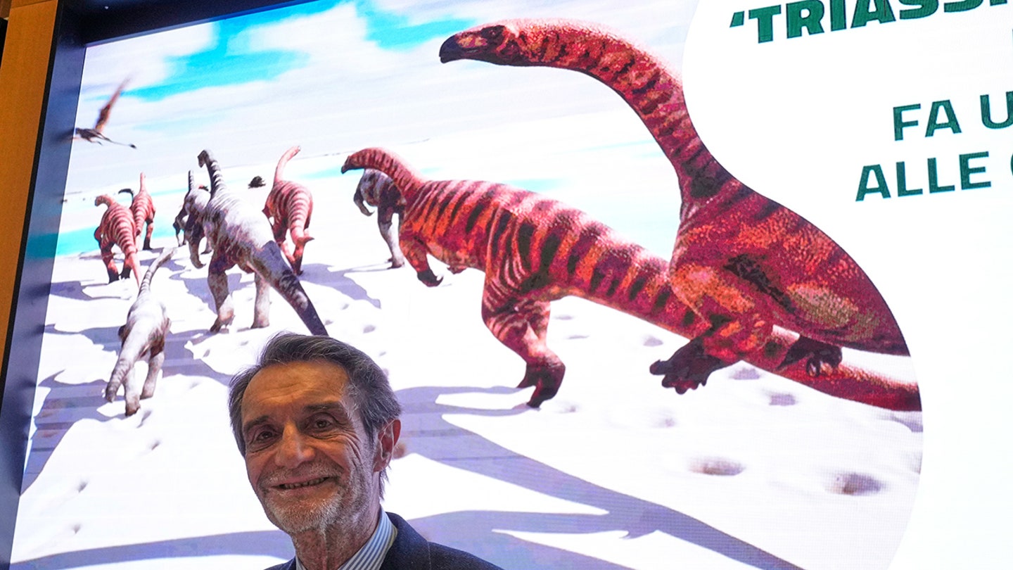 Lombardy Governor Attilio Fontana attends a press conference in Milan, Italy, Tuesday, Dec. 16, 2025, about a discovery of thousands of dinosaur tracks in the Lombardy region. (AP Photo/Luca Bruno)
