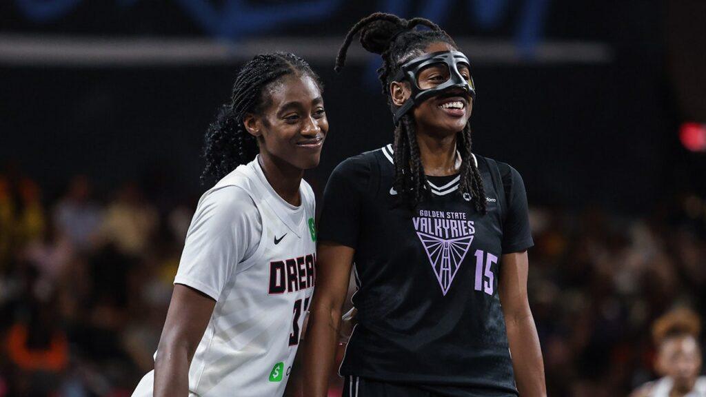 Atlanta Dream Guard Shatori Walker-Kimbrough, #32, smiles on the field with Golden State Valkyries Guard Tiffany Hayes, #15, in the fourth quarter of Gateway Center Arena in College Park in College Park, Georgia, July 29, 2025. (Jordan Godfree-IMAGN images)