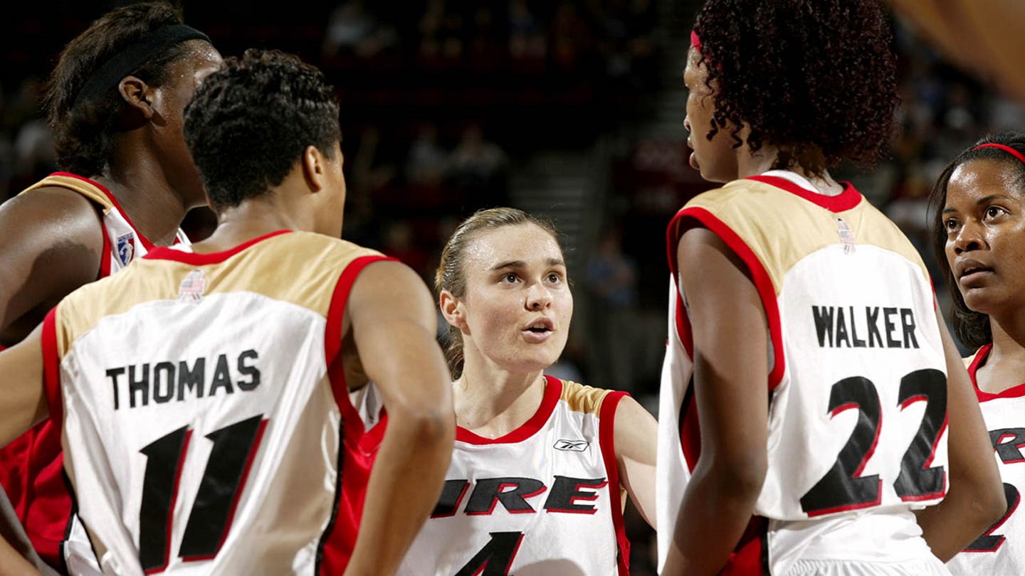 Tully Beligaqua (4) from Portland Fire talks to Demya Walker (22) and teammates during a game against Phoenix Mercury 11 August 2002 at Rose Garden in Portland, Ore. (Sam Simplcich/Wnbae/Getty Images)