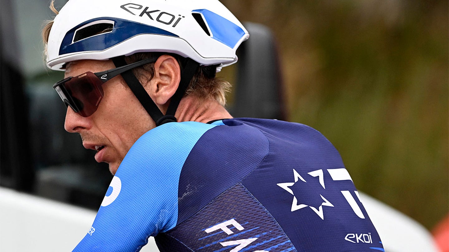 Team Israel Premier Tech’s Czech rider Jan Hirt is depicted after the 14th phase of Vuelta a España Cycling Tour, a 135 -kilometer race between Aviles and La Farrapona. Israel Premier Tech removed his name from his kit on Vuelta a España following the pro-Palestine protests aimed at the team during the race in Somiedo, Spain, on September 6, 2025. (Miguel Riopa/AFP via Getty Images)