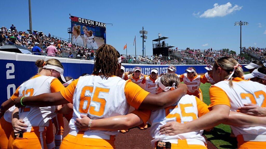 Tennessee hugs before Women’s College World Series Softball game on Sunday. (Sarah Phipps/Oklahoman/USA Today Network via Imag images)
