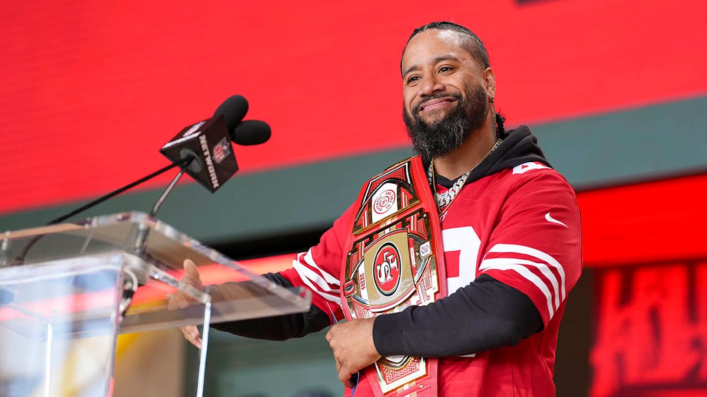 WWES JIMMY USO announces an election to the San Francisco 49ers during the third day of 2025 NFL Draft on April 26, 2025 in Green Bay, Wisconsin. (Perry Knotts/Getty Images)