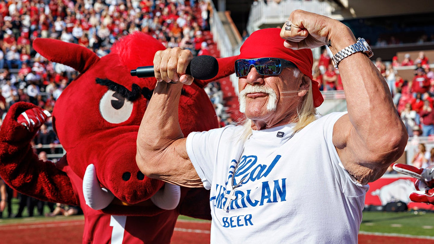 Hulk Hogan is introduced under Texas Longhorn’s Versus Arkansas Razorbacks on Donald W. Reynolds Razorback Stadium on November 16, 2024 in Fayetteville, Arkansas. (Wesley Hitt/Getty Images)