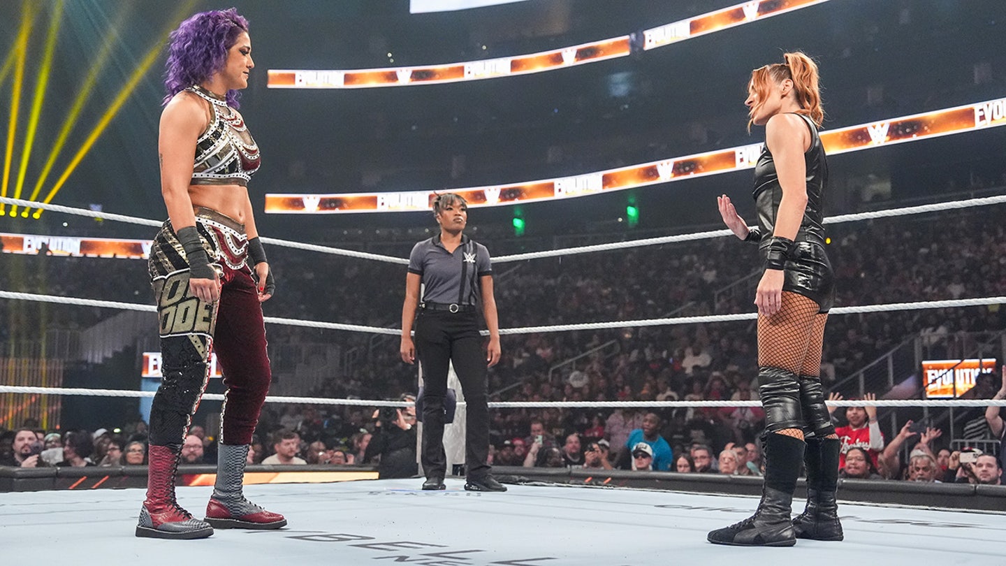 Bayley, Left, and Becky Lynch face under WWE Evolution in the State Farm Arena on July 13, 2025 in Atlanta. (Georgiana Dallas/WWE via Getty Images)