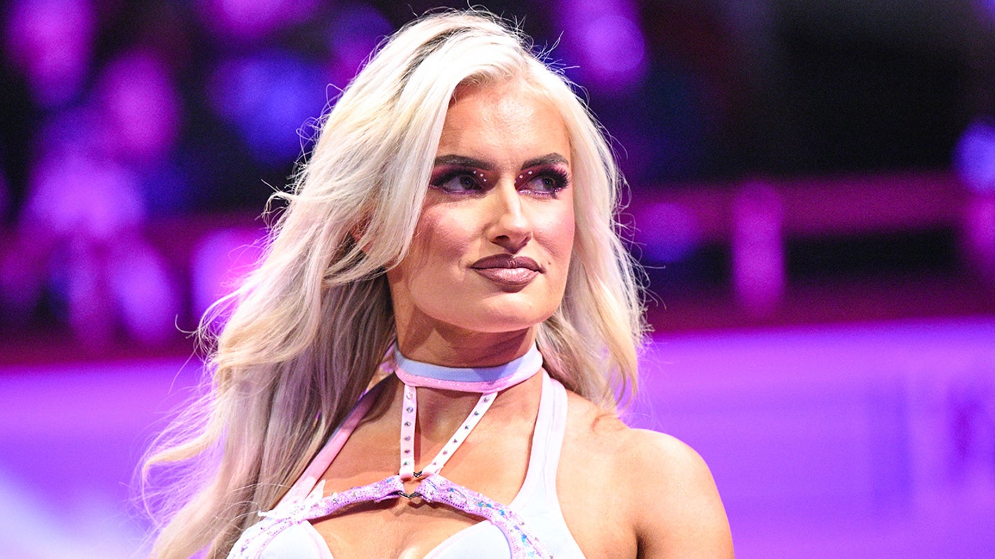 Ash of Elegance accompanied by Heather Reckless and M of Elegance makes their way to the ring under NXT Heatwave at Lowell Memorial Auditorium on August 24, 2025 in Lowell, Massachusetts. (Michael Owens/WWE via Getty Images)
