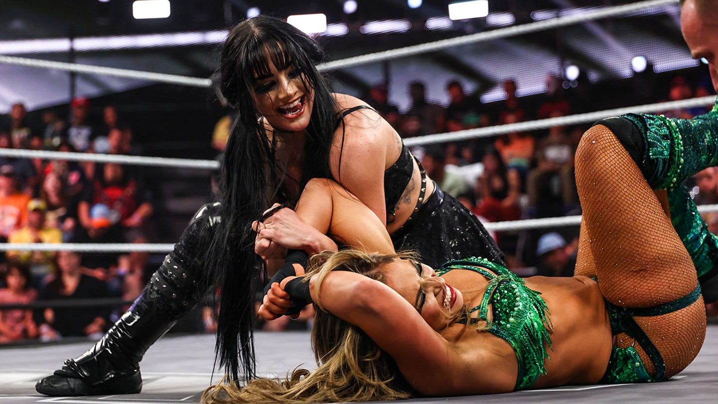 Zaria and NXT Women’s North American Champion Sol Ruca interrupt Fatal Influence during NXT at the WWE Performance Center on July 15, 2025 in Orlando, Florida. (Andrea Kellaway/WWE)