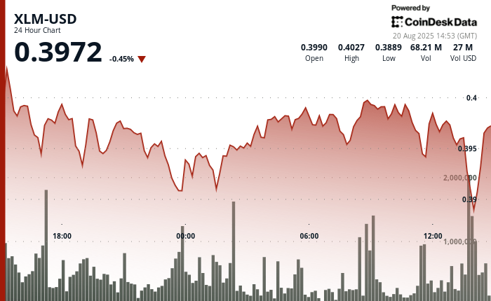 XLM slid into a pronounced bearish trajectory over the last 24 hours, traded between $ 0.39 and $ 0.40 and broken below key support levels. Token’s volatility was intensified in the final trade times on August 20, when prices fell from $ 0.40 to $ 0.39, marking a decisive violation of support that had previously provided MODEMENTUM. The move continues to signalize pressure on the asset despite its attempt to consolidate around the $ 0.40 threshold.