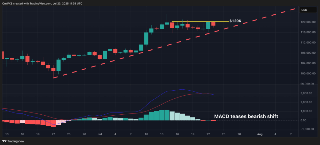 - AI’s Take: Bitcoin shows debilitating momentum as it consolidates below the $ 120,000 resistance where the MACD histogram suggests a potential bearish shift.