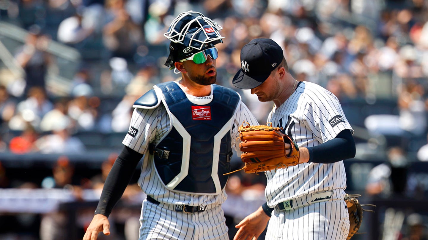 New York Yankees Catcher JC Escarra and Kande Clarke Schmidt Chat during the seventh round of a baseball match against Baltimore Orioles, Saturday, June 21, 2025, in New York. (AP Photo/Noah K. Murray)