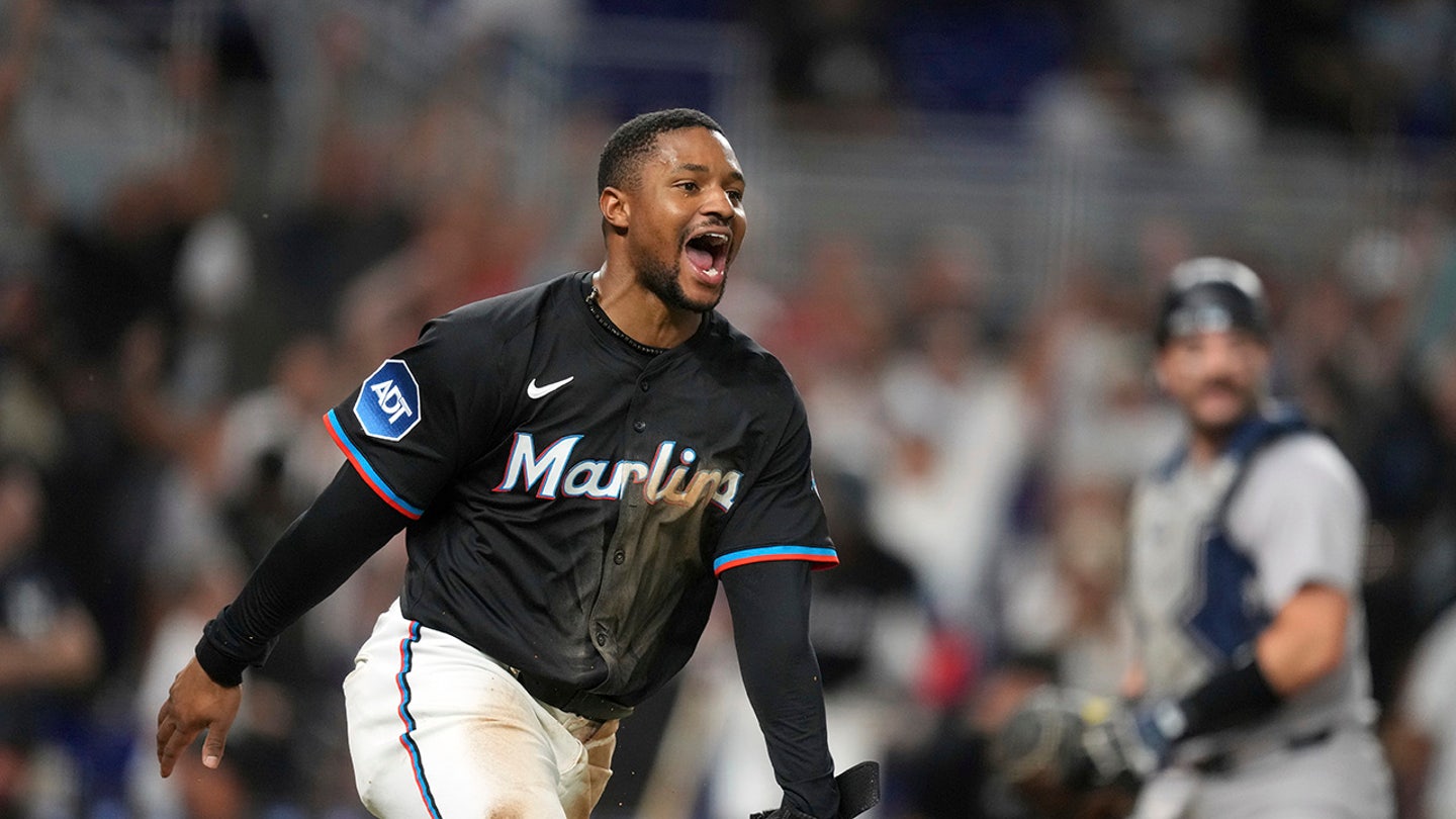 Miami Marlins’ Xavier Edwards celebrate after scoring the winning race in the ninth lap of a baseball match against New York Yankees, Friday, August 1, 2025, in Miami. (AP Photo/Rebecca Blackwell)