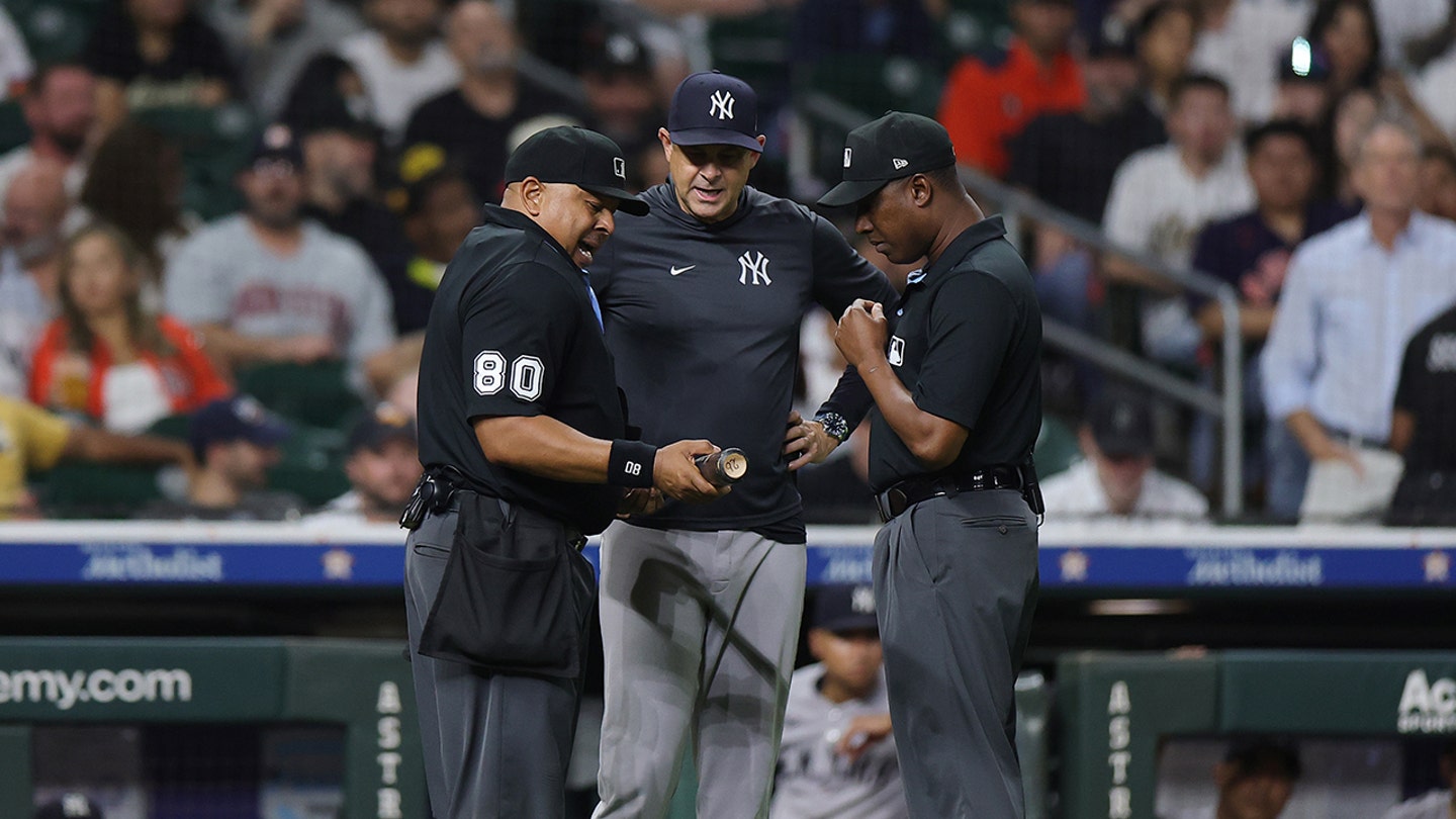 (LR) Umpire Adrian Johnson #80, Aaron Boone #17 from New York Yankees and Umpire Ramon de Jesus #18 Examine a bat belonging to Taylor Trammell #26 of Houston Astros during the ninth round against New York Yankees in Daikin Park on September 04, 2025, in Houston, Texas. (Alex Slitz/Getty Images)